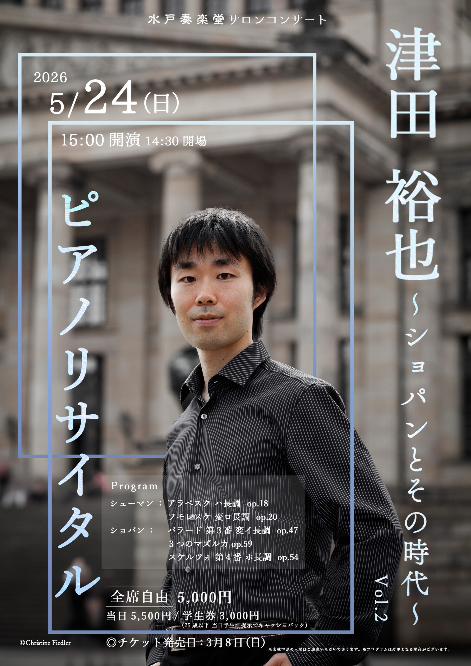 5月18日(日)「津田裕也ピアノリサイタル」は完売となりました。当日券の販売はございません。
